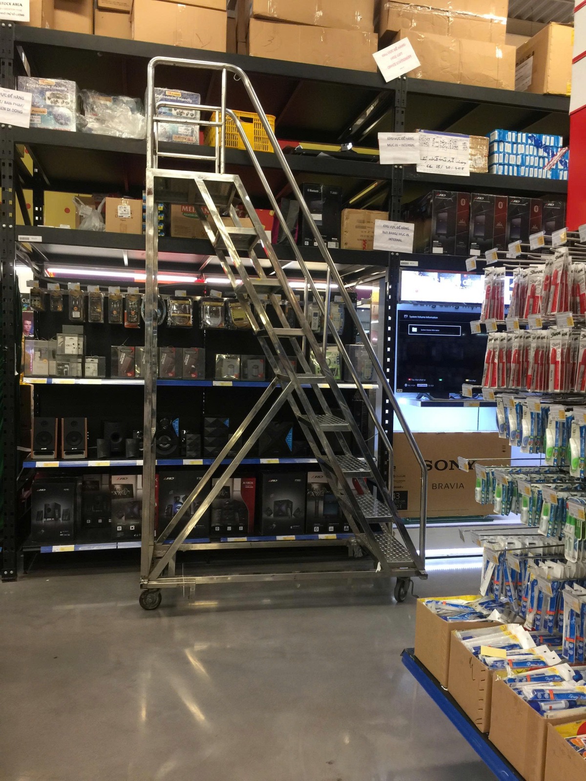 Cơ khí 3s sản xuất Thang Inox Chữ A – Thang inox hàn cố định cho siêu thị là dòng thang gấp gọn đa năng được chế tạo từ inox 201 hoặc 304 cao cấp, mang lại khả năng chống gỉ sét và chịu tải trọng vượt trội lên đến 150kg-300kg. Sản phẩm thiết kế dạng chữ A giúp đứng vững độc lập mà không cần điểm tựa, phù hợp cho mọi nhu cầu từ sửa chữa gia đình đến thi công công trình.